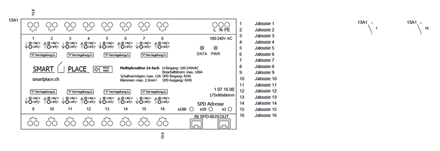 Mit den Taster- und Aktor-Symbolen der Firma SMART PLACE AG lassen sich Steuerungslösungen für Licht, Jalousien, Heizung und weitere Anwendungen einfach und normgerecht im Elektroschema oder Installationsplan darstellen. Der kompakte Multiplex 16 bietet 16 bistabile Relais (13 A / 230 V AC) zur flexiblen Ansteuerung verschiedenster Verbraucher. Für die Jalousien können Relais elektromechanisch verriegelt werden.